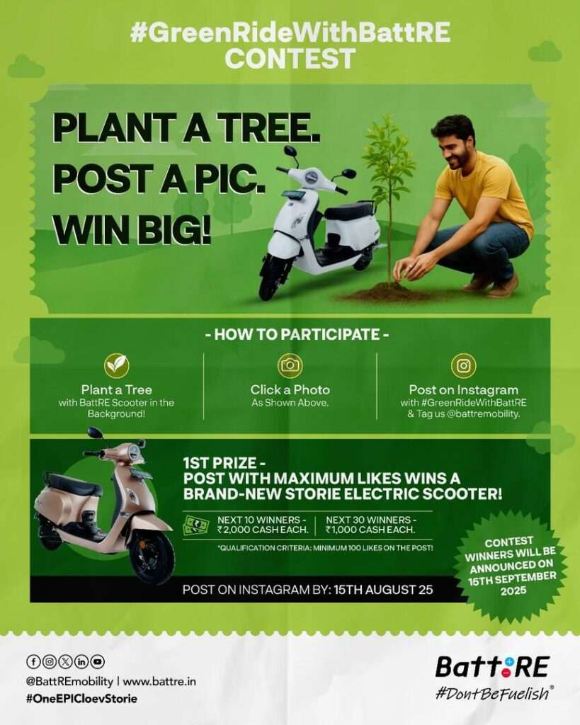 Running until August 15, 2025, the contest invites individuals to plant a tree, capture a photograph with it alongside a BattRE scooter in the background, and share the image on Instagram using the hashtag #GreenRideWithBattRE while tagging @battremobility.