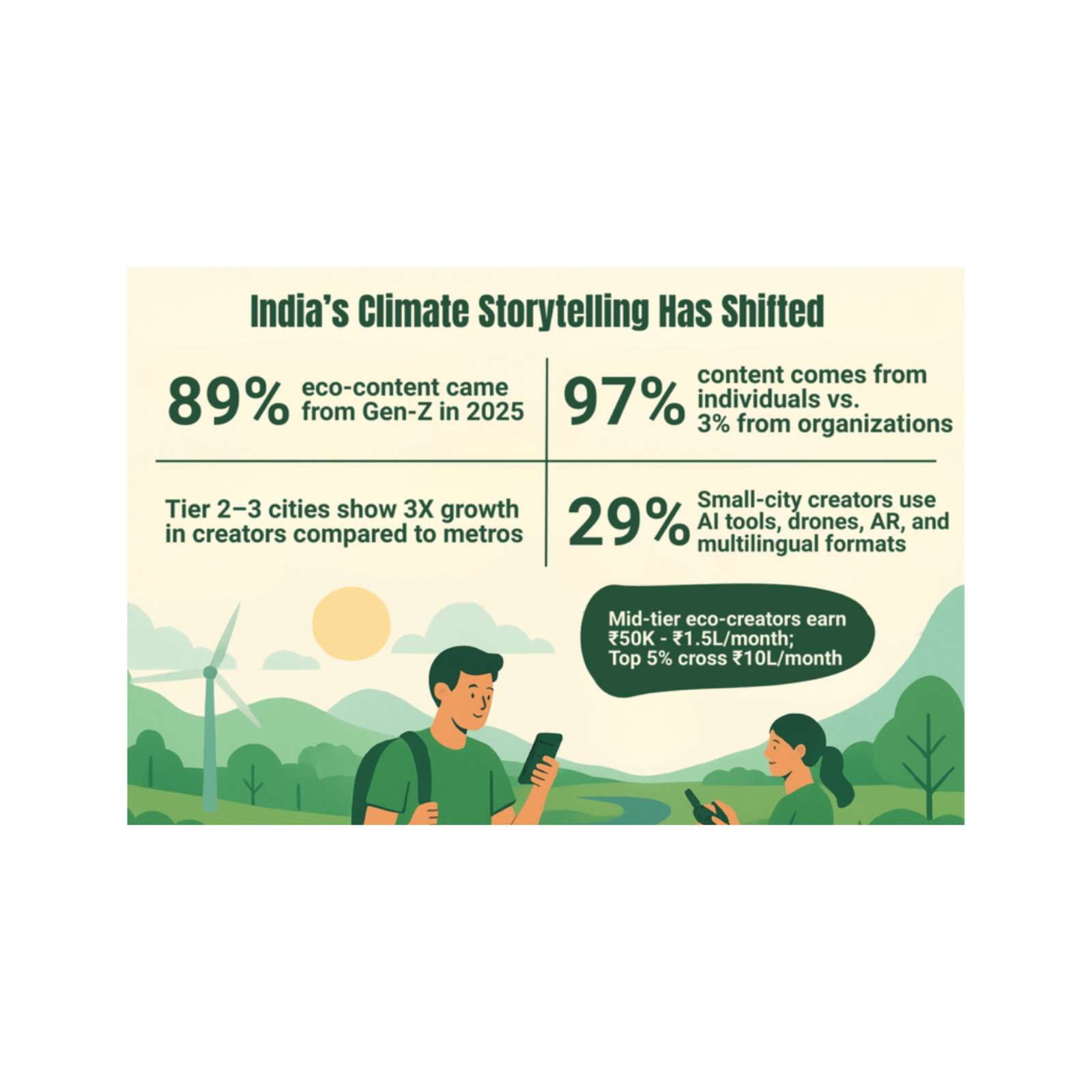 Technology adoption is shaping the future of the green creator economy. In 2025, about 29% of Tier 2–3 creators used AI for editing, scripting, or optimization, while drones, AR filters, and multilingual content formats boosted engagement. Monetization is also accelerating—mid-tier creators are now earning ₹50,000–₹1.5 lakh per month, with top 5% crossing ₹10 lakh through partnerships and campaigns. Even micro-influencers are gaining traction due to high engagement on storytelling-led content.