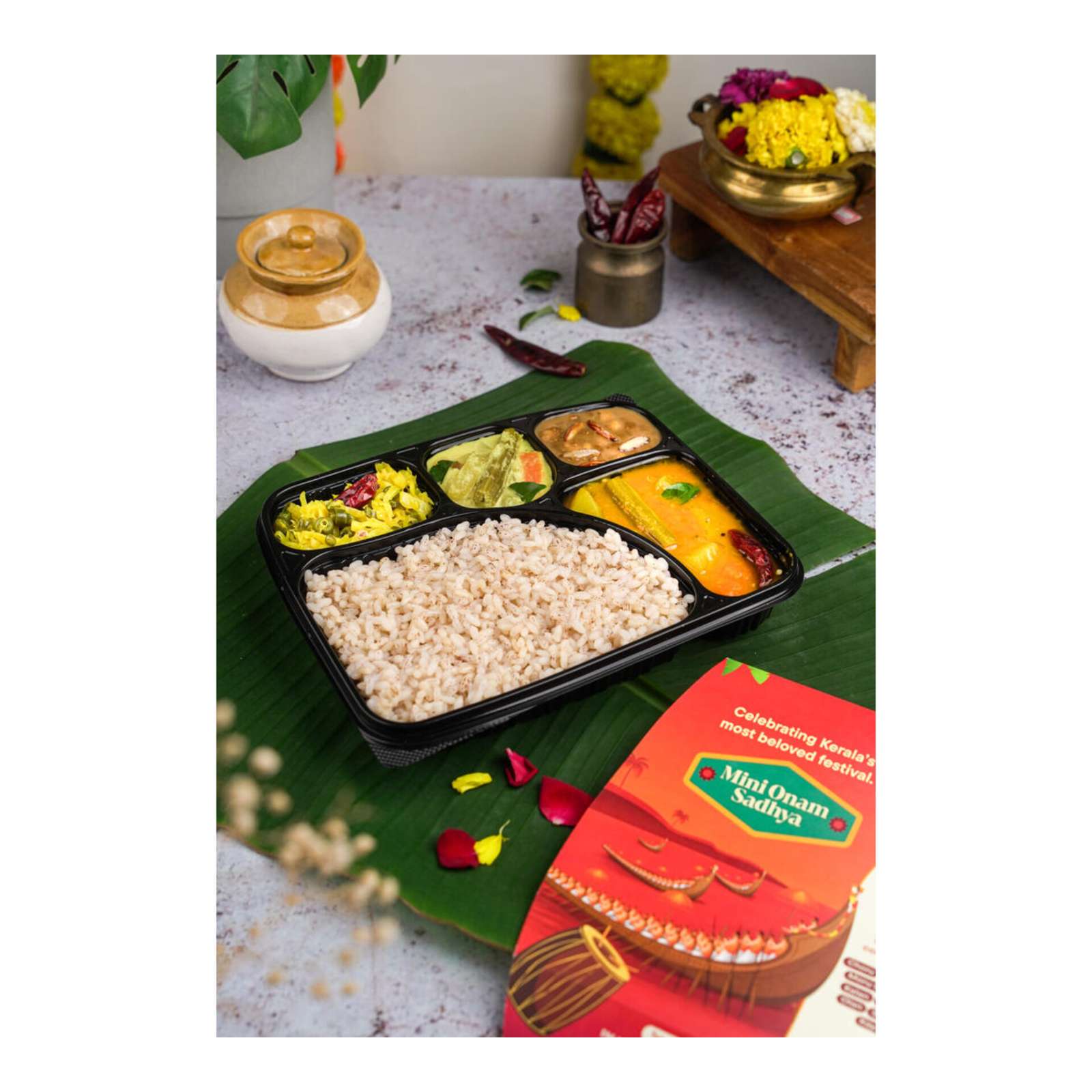 The Onam Sadhya, typically served on a banana leaf, is a grand vegetarian spread featuring over 20 authentic dishes such as Kaalan, Avial, Thoran, Erissery, and Olan. LunchBox has created a compact yet authentic version of this festive platter, making it available to customers across India.