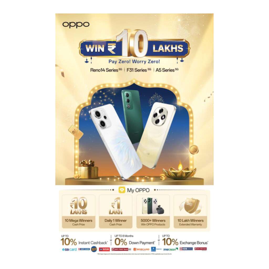 Attractive offers on F31, Reno14, A5 and K Series smartphones with zero down payment, interest-free EMIs, cashback, and mega raffle prizes worth ₹10 Lakh