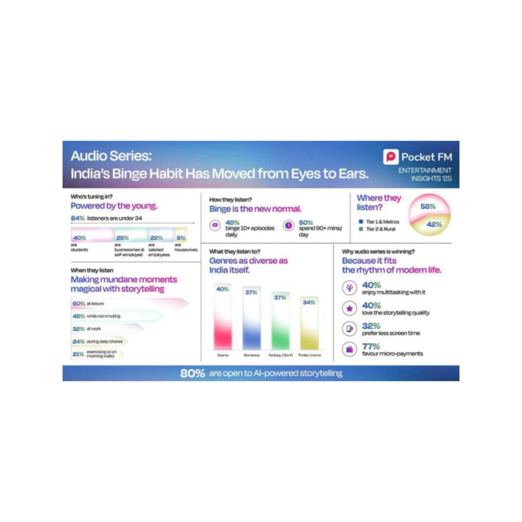 India, September 8, 2025: Audio is emerging as India’s new screen, according to Pocket FM’s Entertainment Insights ’25 report, one of the country’s largest entertainment surveys covering 20,538 digital entertainment consumers nationwide. The findings reveal that audio series are now deeply embedded in daily life, surpassing traditional video bingeing as millions turn to immersive storytelling through sound.