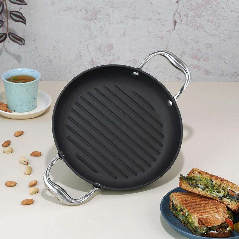 A 26 cm Roti Tawa (₹3,290), a 27 cm Dosa Tawa (₹3,990), and a 24 cm Grill Pan (₹3,290)
